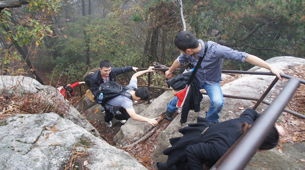 到達(dá)目的地用過午餐,全體成員便整裝待發(fā),完成此次拓展訓(xùn)練最艱難的項目--攀登天屏峰。天屏峰海拔高度1605米,山峰險峻、陡峭無比,全路段多為樹根、石塊堆出的小道,多處攀爬必須手腳并用,甚至要靠隊友幫助,攀登而上極為挑戰(zhàn)體能。