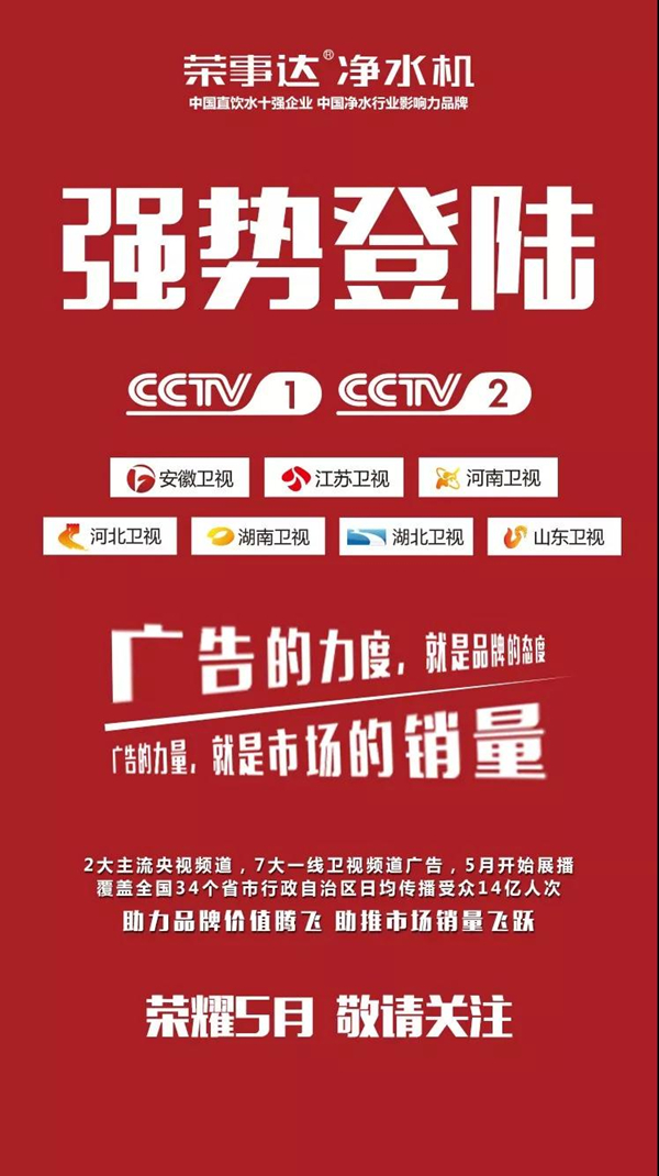 記者了解到,5月下旬,榮事達凈水機2018廣告新片將率先登陸CCTV1、CCTV2兩大央視平臺,屆時將向全國觀眾呈現榮事達獨特的精神理念與品牌形象。