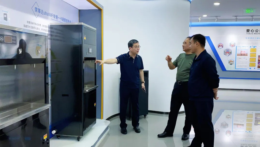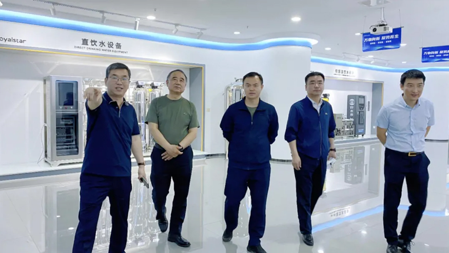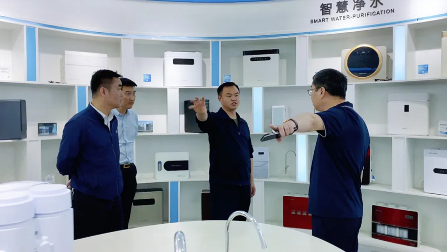 領導一行參觀了解集團的全屋智慧凈水項目、社區(qū)智慧飲水項目以及校園直飲水項目等。