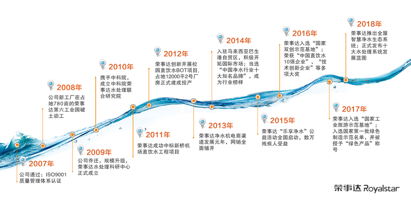 2018年5月,榮事達(dá)正式發(fā)布十大水處理系統(tǒng)發(fā)展藍(lán)圖,全面布局全屋智慧凈水、校園直飲水、城市公共飲水、社區(qū)智慧飲水、農(nóng)村安全飲水、工業(yè)污水處理、生活污水處理、景觀水處理、醫(yī)療用水處理、海水淡化十大領(lǐng)域。